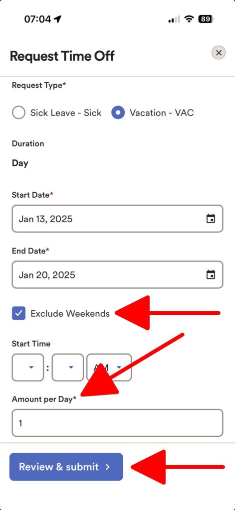 - NOTE: If your request spans one or more weekend days, then UNCHECK the “Exclude Weekends” checkbox, or your vacation request will be reduced by the weekend days your request spans.